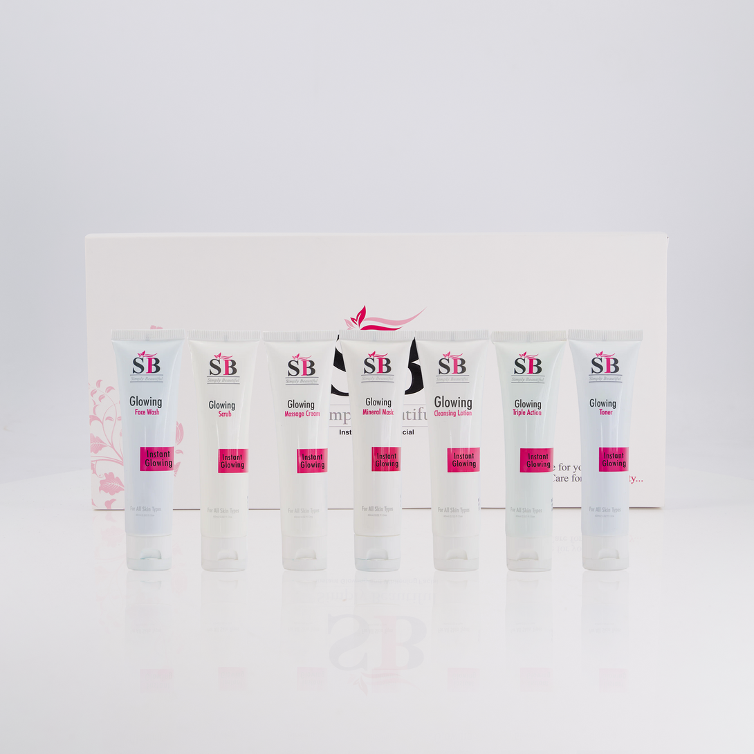 The SB skincare range offers a complete solution for achieving smooth, radiant, and healthy skin. The Facial Scrub exfoliates with apricot kernels to remove dead skin cells, leaving the skin refreshed. The Massage Cream nourishes with antioxidants, promoting circulation and radiance. The Glowing Mineral Mask detoxifies, lightens sun damage, and provides hydration. The Cleansing Lotion removes makeup, cleanses pores, and restores the skin's moisture balance. The Face Wash clears dirt, oil, and pollutants while maintaining hydration and pH levels. The Facial Toner removes impurities and dead skin cells, leaving the skin radiant. Together, these products cleanse, exfoliate, nourish, and protect the skin, ensuring a glowing and youthful complexion.